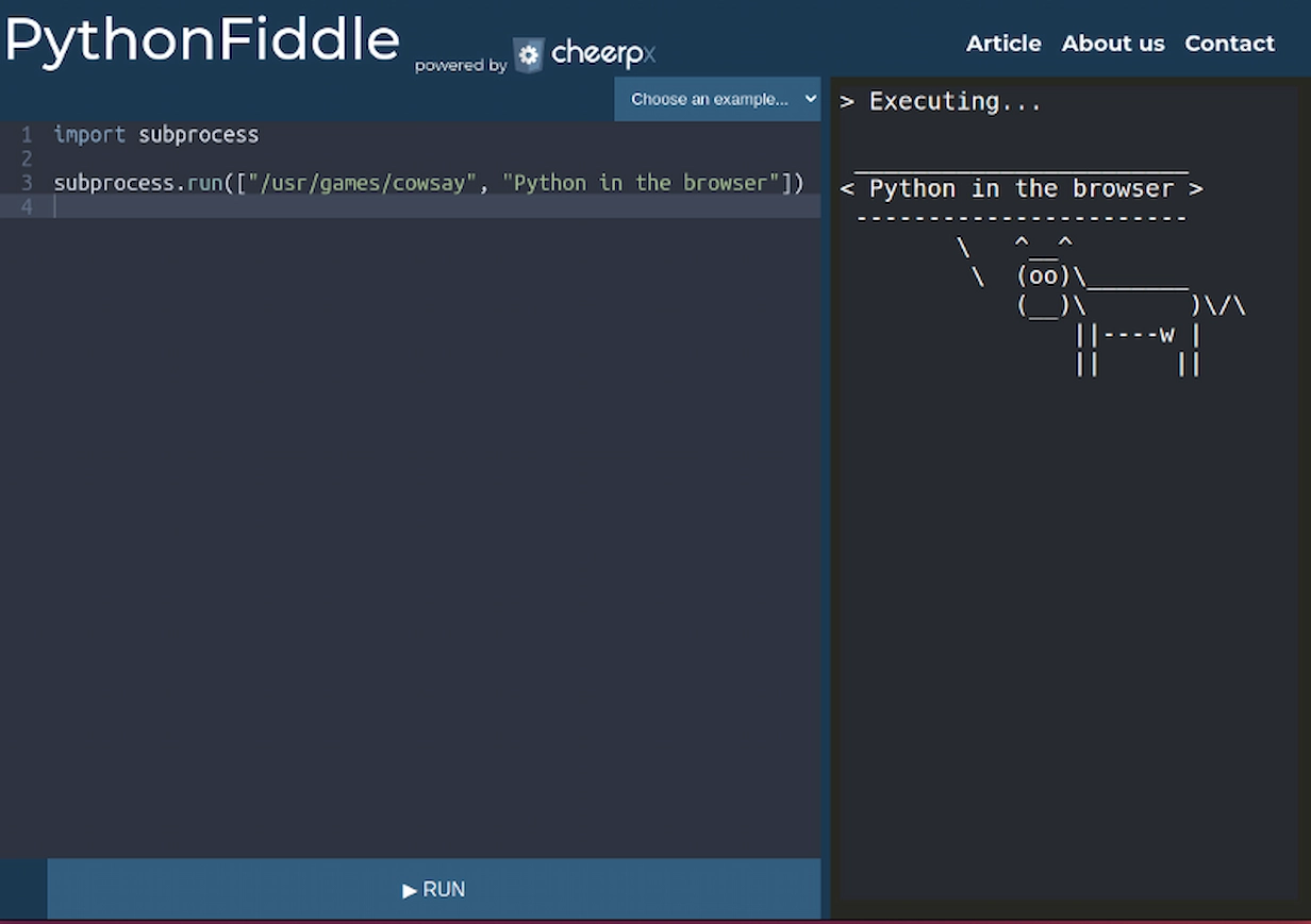 Now we’re releasing PythonFiddle, a similar environment, that allows the user to play around with python. This time, however, it’s based on CheerpX